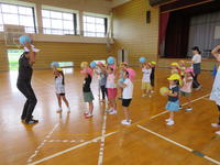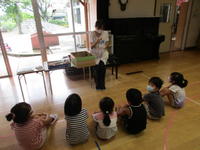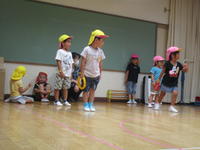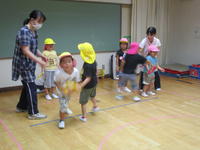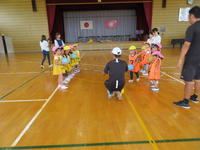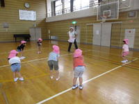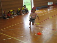 年少(たんぽぽ組)は、遊戯室において運動会のリレーの練習をしました。スタートの仕方、折り返しのポストの回り方、バトンの渡し方を二つに分かれて繰り返し練習しました。子どもたちは、年長のリレーを見学したこともあり、すぐに方法を理解しました。運動会まで1か月、これからも練習を重ねていきますので、本番では手に汗握る競走が展開されると思います。
