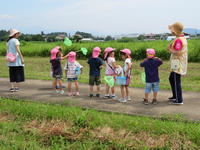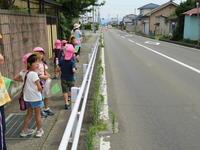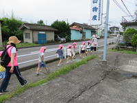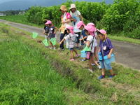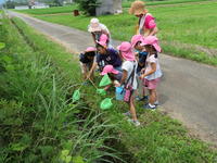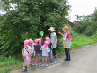 年長(ちゅうりっぷ組)は、継続してエルマーの冒険ごっこで遊んでいます。エルマーから手紙をもらい、エルマーに幼稚園のことや周辺のことを教えるために、梅雨の晴れ間を利用し、幼稚園の周りに冒険に出かけてきました。子どもたちは、いろいろな植物や生き物、更には風景を興味深く観察していました。
