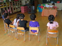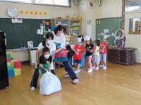 年少(たんぽぽ組)は、「おおきなかぶ」のペープサートで遊びました。子どもたちは、はじめに担任のペープサートを見てから、自分で動かしたいおじいさん、おばあさん、犬などになりきって、「うんとこしょ、どっこいしょ」の掛け声に合わせて楽しく演じていました。