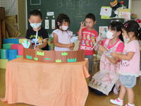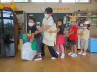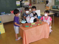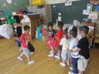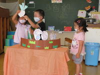 2020年7月28日 15時40分年少(たんぽぽ組)は、「おおきなかぶ」のペープサート遊びから発展し、スカートを身に着けたり、犬や猫、ねずみなどの面をかぶったりして、それぞれの役になりきって劇遊びを楽しみました。子どもたちは、「うんとこしょ、どっこいしょ」と大きな掛け声で一生懸命にかぶを引き抜いていました。