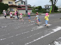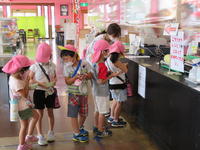 年長(ちゅうりっぷ組)は、昨日に引き続き幼稚園の外に冒険に出かけました。今回は足を伸ばして、商店が集まっている地区まで出かけ、お店では各自が自分の希望するおにぎりを買い、支払いまで体験しました。また、先日、幼稚園で行った交通安全教室で学んだ、横断歩道の渡り方等についても実地で体験しました。