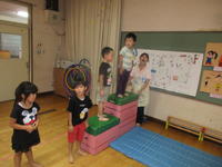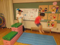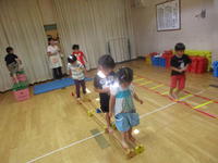 年少(たんぽぽ組)は、遊戯室において忍者の修行をして遊びました。子どもたちは、忍者の先生から励ましの巻物をいただき、橋渡しの術、跳び下りの術、丸太渡しの術の練習に励みました。