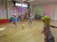 年長(ちゅうりっぷ組)は、遊戯室でドッジボールを行いました。子どもたちは、ピンクチームと黄色チームに分かれ、どのようにしたら勝つことができるか作戦を練って、ゲームを行いました。ボールをうまく投げたり、避けたりすることができるようになってきました。