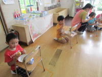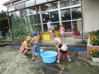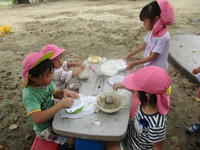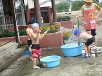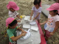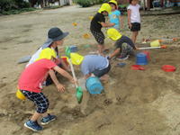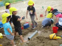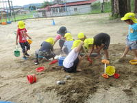 年少(たんぽぽ組)は、家庭訪問のために今週は午前保育となります。子どもたちは、砂遊びをしたり、水遊びをしたりと、梅雨空を吹き飛ばすくらいに思いっきり遊びました。