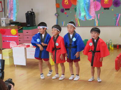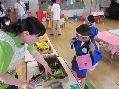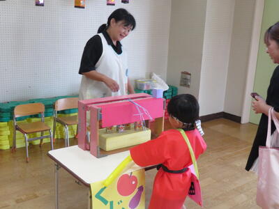 まずは園児たちがお店屋さんになって、お家の方に遊んでもらいました。「いらっしゃい いらっしゃい」元気良い掛け声で始まりました。