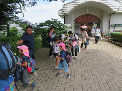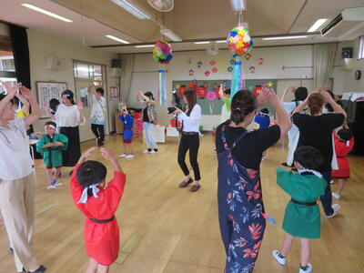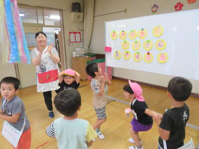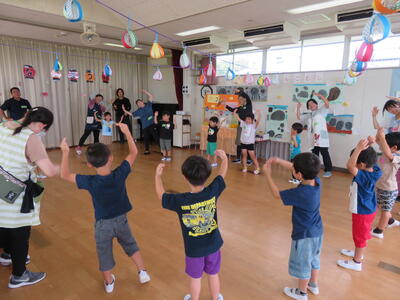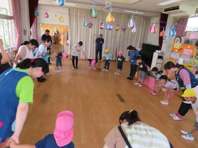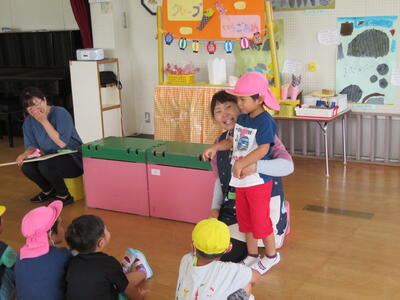 園に到着して、庭塚幼稚園の園長先生のお話を聞いた後、みんなでリズム「くわがた体操」をしました。