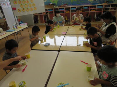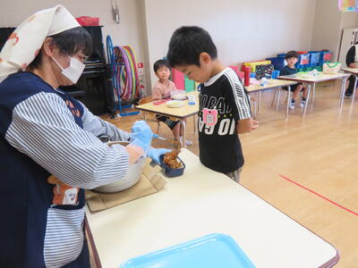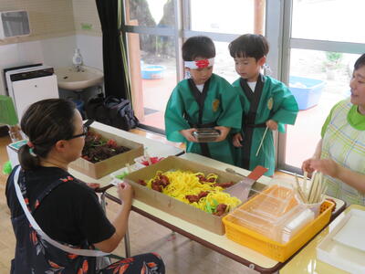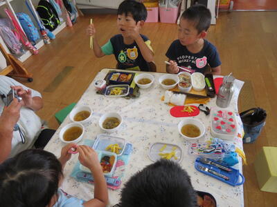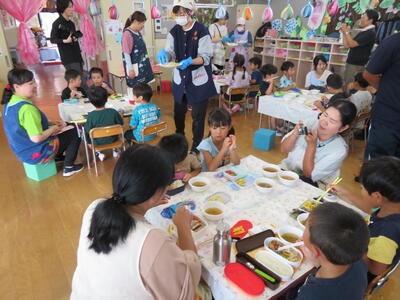 いよいよ待ちに待った昼食の時間となりました。今回は庭塚幼稚園の園長先生がみそ汁とフライドポテトを作ってくださいました。みんなでおいしくいただきました。