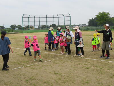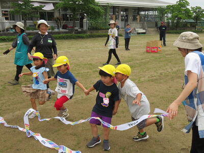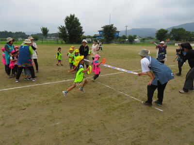 続けてリレーです。一生懸命走りました。結果は僅差でピンクチームの勝ちでした。