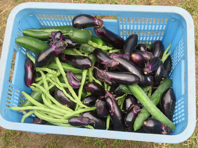 リレーの後は野菜採りをしました。キュウリ ナス インゲン ピーマン をコンテナ一杯分収穫しました。