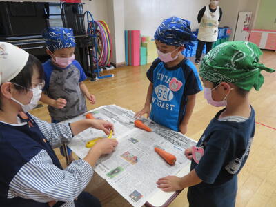 今日は、園で収穫した野菜を使って、野菜カレーパーティーです。