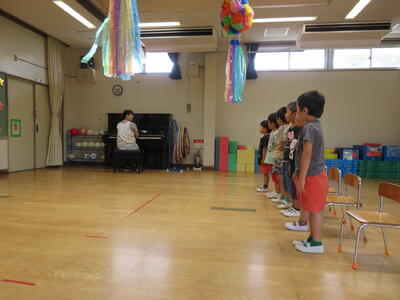 登園して少し遊んでから、遊戯室で始業式を行いました。久しぶりに会った子どもたちが、みんなとっても元気で安心しました。
