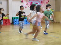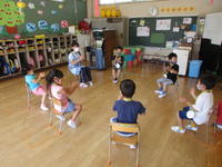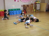 6月15日(月)、年長はリトミックを楽しみました。教師が弾くピアノの曲の速さやリズムに合わせ、ウサギ、クモ、アザラシ、クマなどの生き物になりきって、思い思いに動き回りました。子どもたちは額からは汗が吹き出すほどに、一生懸命に動きまわり楽しんでいました。