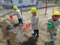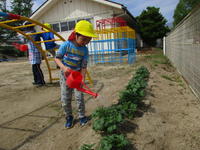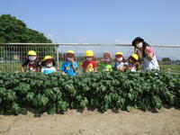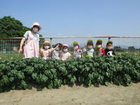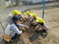 4月15日(水)に植えたジャガイモが、子どもたちの腰の高さくらいに大きく成長し、花が咲きました。子どもたちは登園した際に、ジャガイモの成長の様子を観察したり水をやったりして管理しています。今回は、年長が土づくりから行い、元肥として牛糞を入れて耕しました。7月中旬には収穫する予定で、子どもたちはどれくらい収穫できるか楽しみにしています。