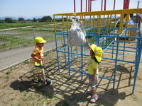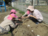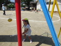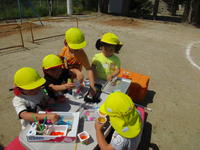 年少(たんぽぽ組)は、園庭で好きな遊びを楽しみました。幼稚園生活にまだまだ慣れていない面がありますが、忍者になって悪者をやっつけたり、色水で作ったジュースをみんなで飲む真似をしたり、キックバイク、ブランコに乗ったりと、それぞれ思い思いの遊びを十分に楽しみました。