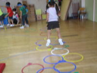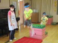 年少(たんぽぽ組)は、遊戯室においてラバーフープや巧技台、マットなどを使って作った修行の場で、子どもたちがそれぞれに忍者になりきって挑戦しながら遊びました。一番の人気は巧技台からの飛び降り修行で、見ている方がハラハラするくらいにジャンプして楽しんでいました。