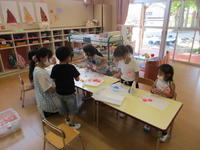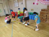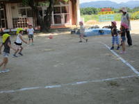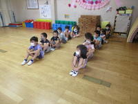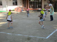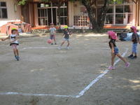 6月9日(火)、年長(ちゅうりっぷ組)は、グループに分かれてドッジボールを行いました。まだまだボールを片手で投げることは難しいですが、相手をねらってボールを投げたり、ボールに当たらないように上手く逃げたりし、楽しんでいました。次回からは、チームで作戦を立てさせたり、投げ方を工夫させたりして行わせる予定です。