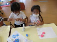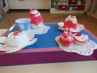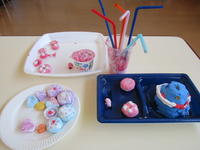 年長(ちゅうりっぷ組)は、紙粘土やビーズ、プラスチック容器などを使って、いろいろなごちそうを作りました。子どもたちが作ったケーキ、クッキー、シェイクなど、どれも本物のようで思わず食べてしまいそうになるものばかりでした。今後は、ごちそうを増やしていき、お店屋さんができるようにしていく予定です。