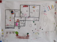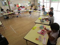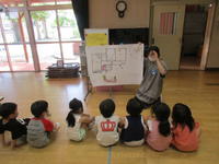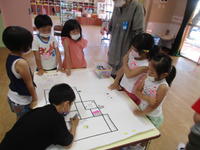 子どもは、児童書「エルマーのぼうけん」に興味関心を抱き、すごろく地図を見たり、ペープサートを見たりしていました。6月9日(火)にエルマーから手紙が届いたので、エルマーに佐倉幼稚園のことを教えるための幼稚園の地図を作り、返事を出そうということになりました。そして、6月10日(水)に、みんなで協力して地図を作りました。教師が普段気が付かないようなところまで、子どもたちは気づき、地図にいろいろと書き込んでいました。自分の思いを相手に伝えようと頑張っている姿が見られました。