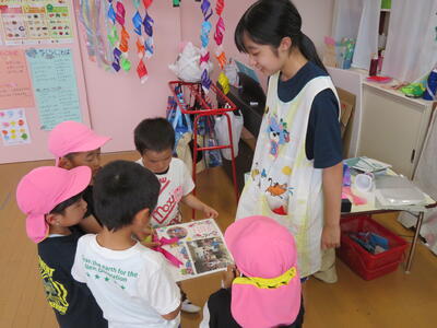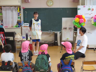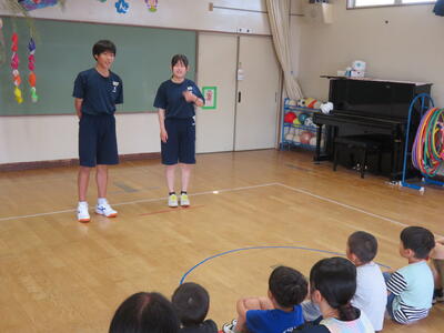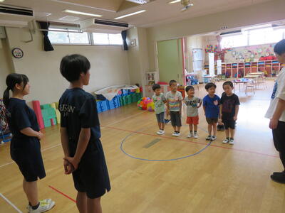 先週に続き、今週は今日から金曜日まで西信中学校の男子1名、女子1名の計2名の生徒がドリームアップ事業として幼稚園に来ます。