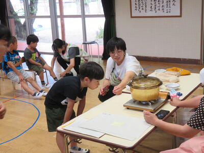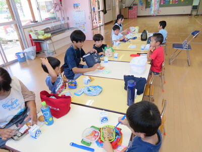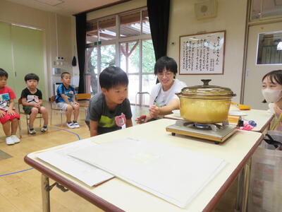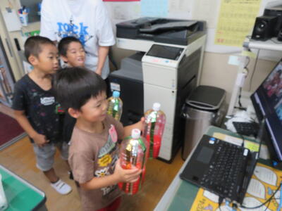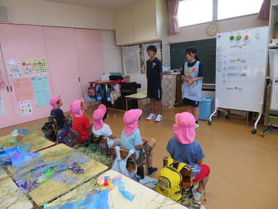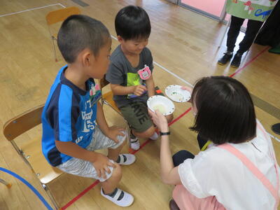 お互いに夏祭りで作成したものや、採れた野菜、カブトムシなどを見せあいました。