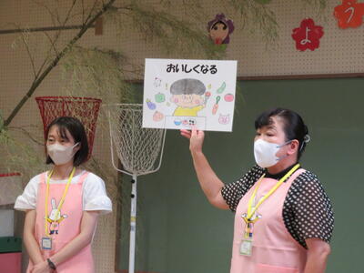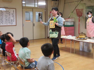 今日も市から管理栄養士さんが2名来園し、食育活動「ごはんのひみつ」を実施しました。