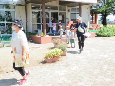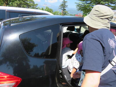 早速車へ向かいます。洪水の際は幼稚園が避難所とならないため、車で避難します。