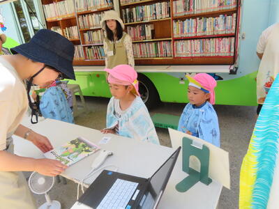 借りたい絵本を選び、貸し出しのテーブルに持っていきます。