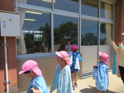 プールに行く途中、1年生に