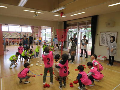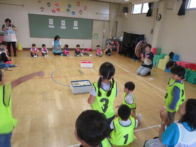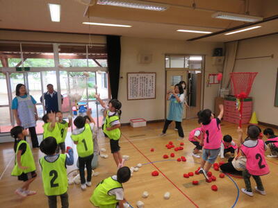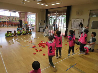 好きな遊びが終わって、次は「チェッコリ玉入れ」をやりました。3園混合で「ピンクチーム」「黄色チーム」に分かれて行いました。みんな真剣そのもの。予定では1回で終わるはずでしたが「もっとやりたい」という声が多かったので急遽2回実施しました。