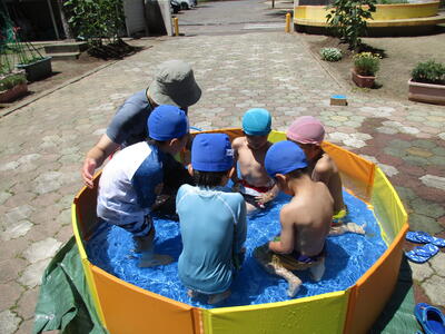 今日は幼稚園のプールです。みんな固まって遊ぶ姿がかわいい!