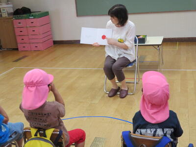 楽しいお話を何冊も読んでいただきました。みんな集中して聞いていました。
