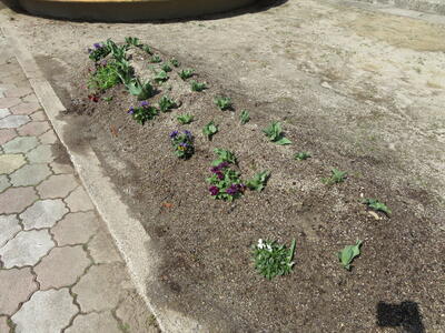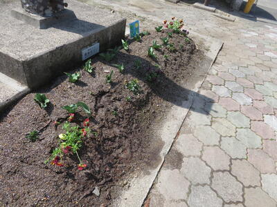 昨年度、みんなで花壇に植えたチューリップがどんどん大きくなってきました。