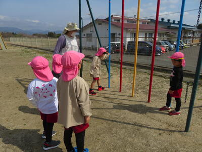 外に出て、遊具の確認をしました。けがをしないようにルールを守って遊びます。