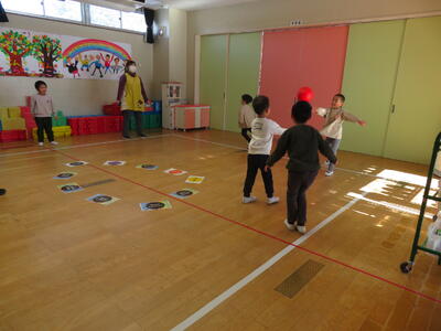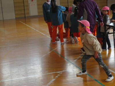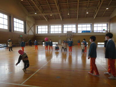 最後はドッジボールです。5年生がキャッチしたボールを園児に投げさせてくれました。こちらも楽しい活動でした。