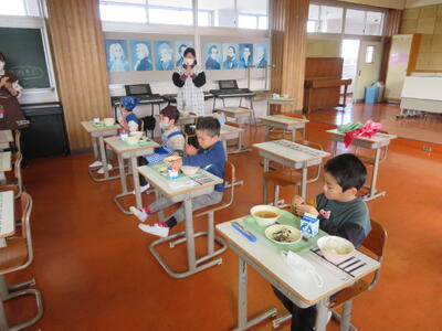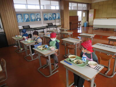 いつも通り自分たちで準備し、お替りもしてほぼ完食しておいしく最後の給食をいただきました。