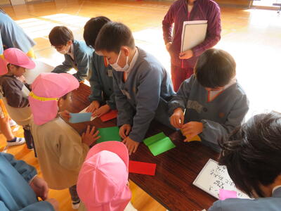 さっそく折り紙を使って手裏剣づくりに挑戦です。5年生が丁寧に教えてくれました。