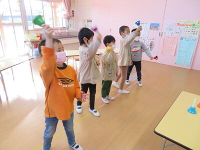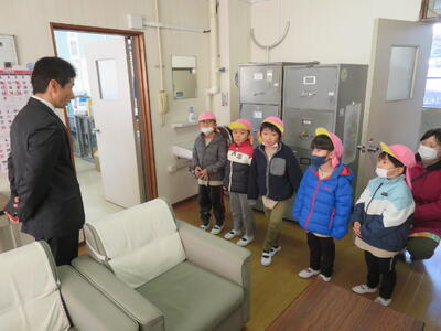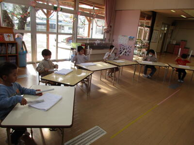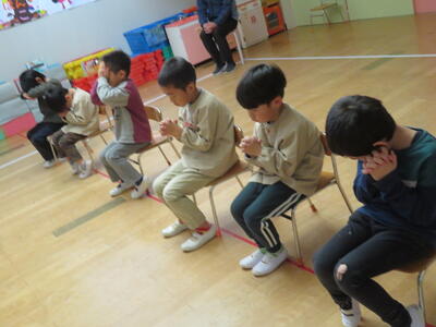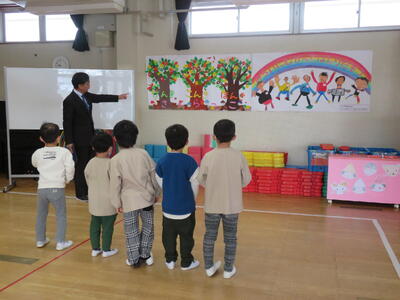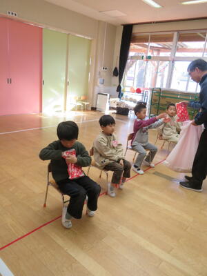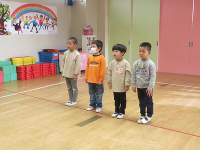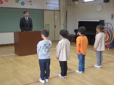 雪遊びが終わって、遊戯室に入り、二学期終業式を行いました。