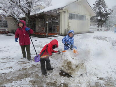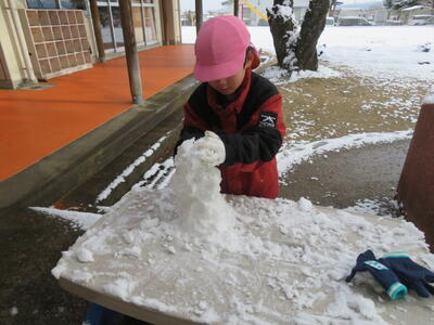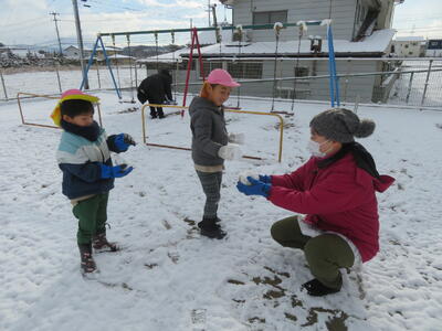 終業式の前に早速園庭に出て、雪ダルマをつくったりして遊びました。