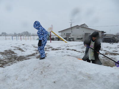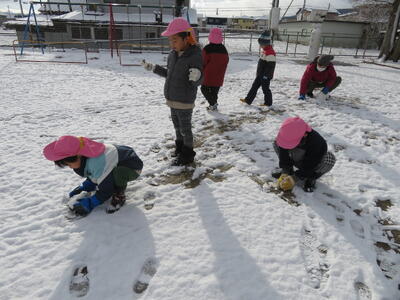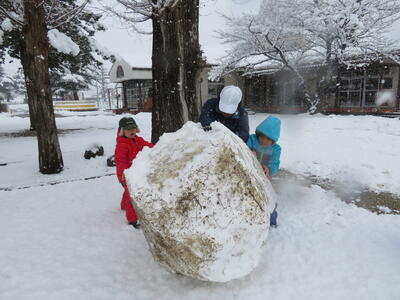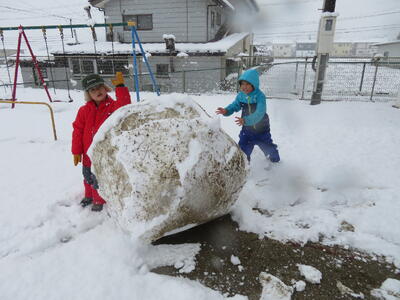 今日は雪玉づくりとそり滑りの台づくりをしました。園児の背丈くらいの雪玉が完成しました。