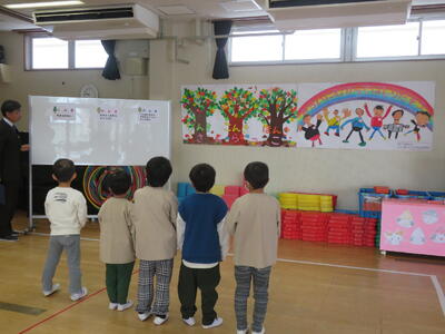 はじめに私から、子どもたちの2学期の頑張りを称えました。3本の木「げん木」「ほん木」「こん木」がいろんな経験を通して、大きく育ってきたことを話しました。