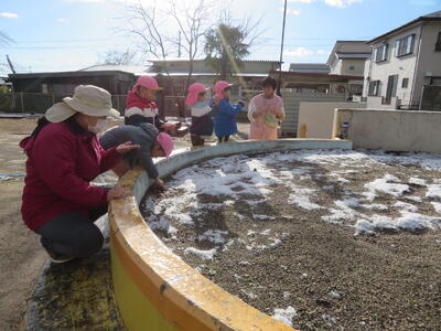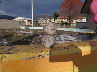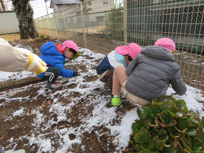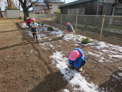 朝登園すると、園庭にうっすらと雪が積もっていました。