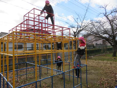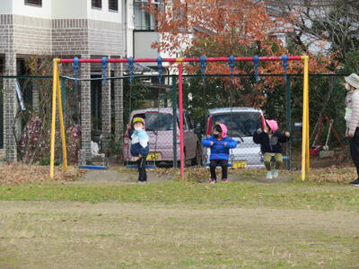 最初に、小学校の遊具で遊ばせてもらいました。「幼稚園のより 大きい!」