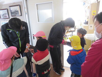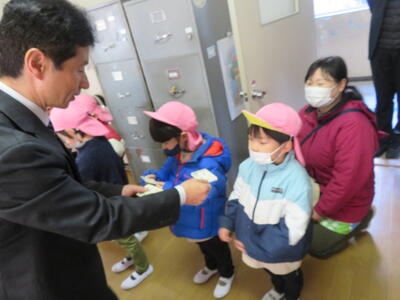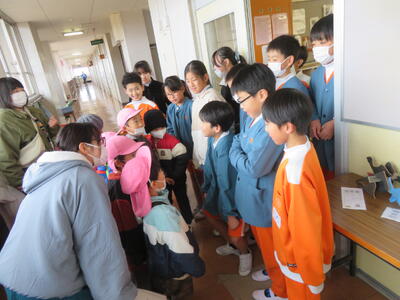 休み時間になったので、小学生が校庭に出てきました。多くの子たちが寄ってきてくれました。佐倉幼稚園卒園の子たちも園児のところに来てくれました。