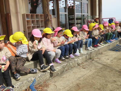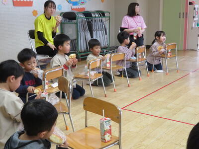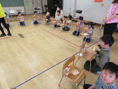 当初は、みんなでパン屋さんによって、パンを買ってから公園で食べる計画でしたが、雨は降っていなかったものの降水が予想されたことから、急遽パンは幼稚園で食べることにしました。