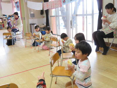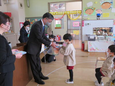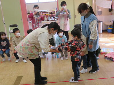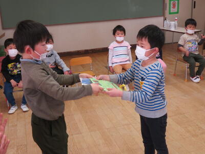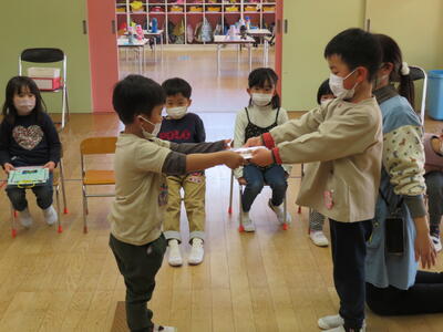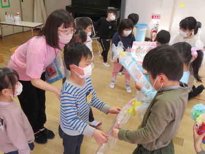 続けて、たんぽぽ組さんから、「すっとともだちのかい」を欠席したちゅうりっぷ組さんに、プレゼントを贈りました。
