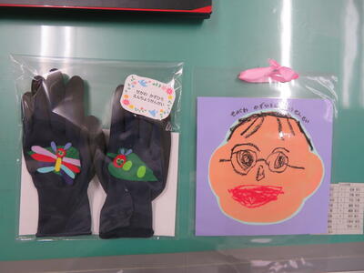 一人一人のメッセージ付き似顔絵と、花や野菜作りの時に使える作業用手袋。かわいい「はらぺこあおむしさん」付きです。