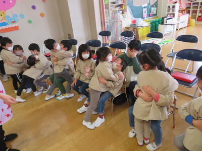 予行が終わった後、たんぽぽ組さんたちがちゅうりっぷ組さんに近寄り、17日頑張ってねのギューをしました。とっても仲良しの子どもたちです。