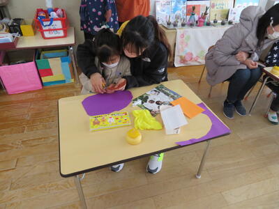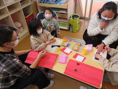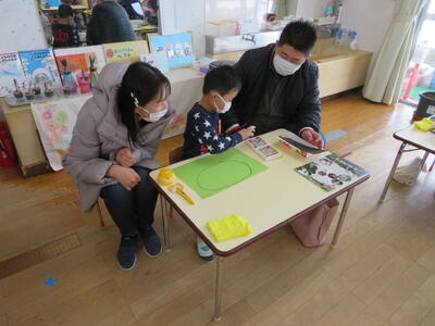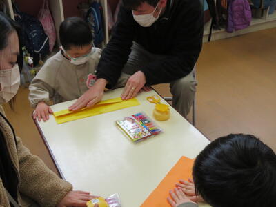 作り方の説明を聞いた後、親子で制作作業開始です。いろいろお話をしながら楽しく鬼のお面作りに取り組みました。