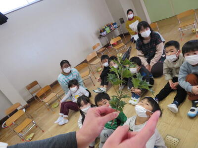 続けてイワシの頭を刺したヒイラギをみました。イワシのにおいに顔をしかめる園児もいました。