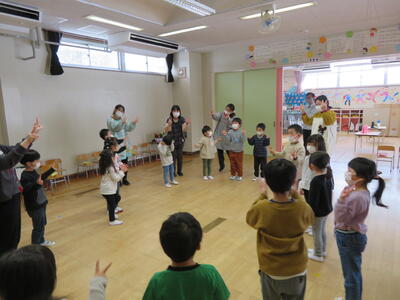 次は年少さんが鬼役 年長さんが豆まきをしました。